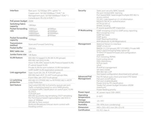 - 24 x cổng RJ45 / PoE + với ngân sách điện 450W hoàn toàn